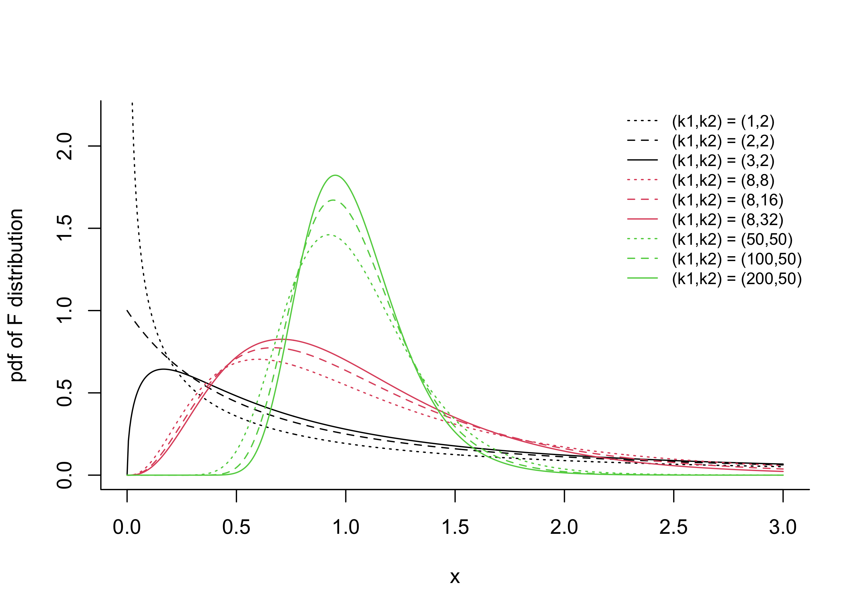 Proposition 31.2 (\(F\) distribution construction) Let \(W_1 \sim\chi_{k_1}^2\) and \(W_2\sim \chi_{k_2}^2\) be independent chi-squared random variables with degrees of freedom \(k_1\) and \(k_2\), respectively. Then \[