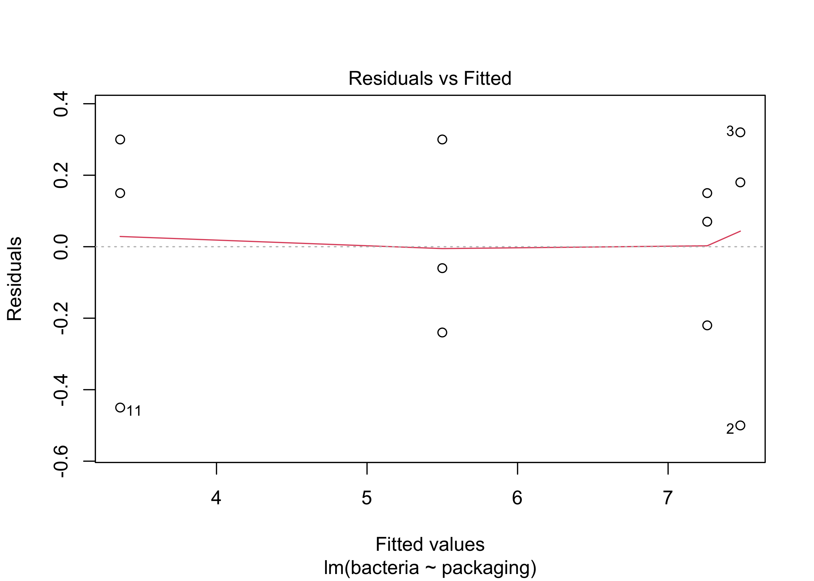 Figure 31.6: Residuals versus fitted values plot for the steak packaging data.