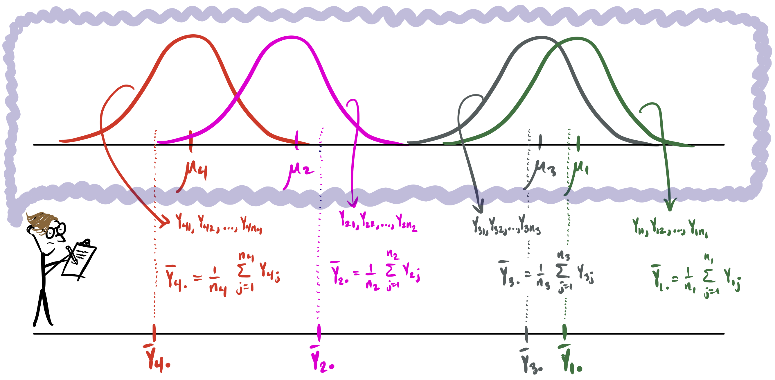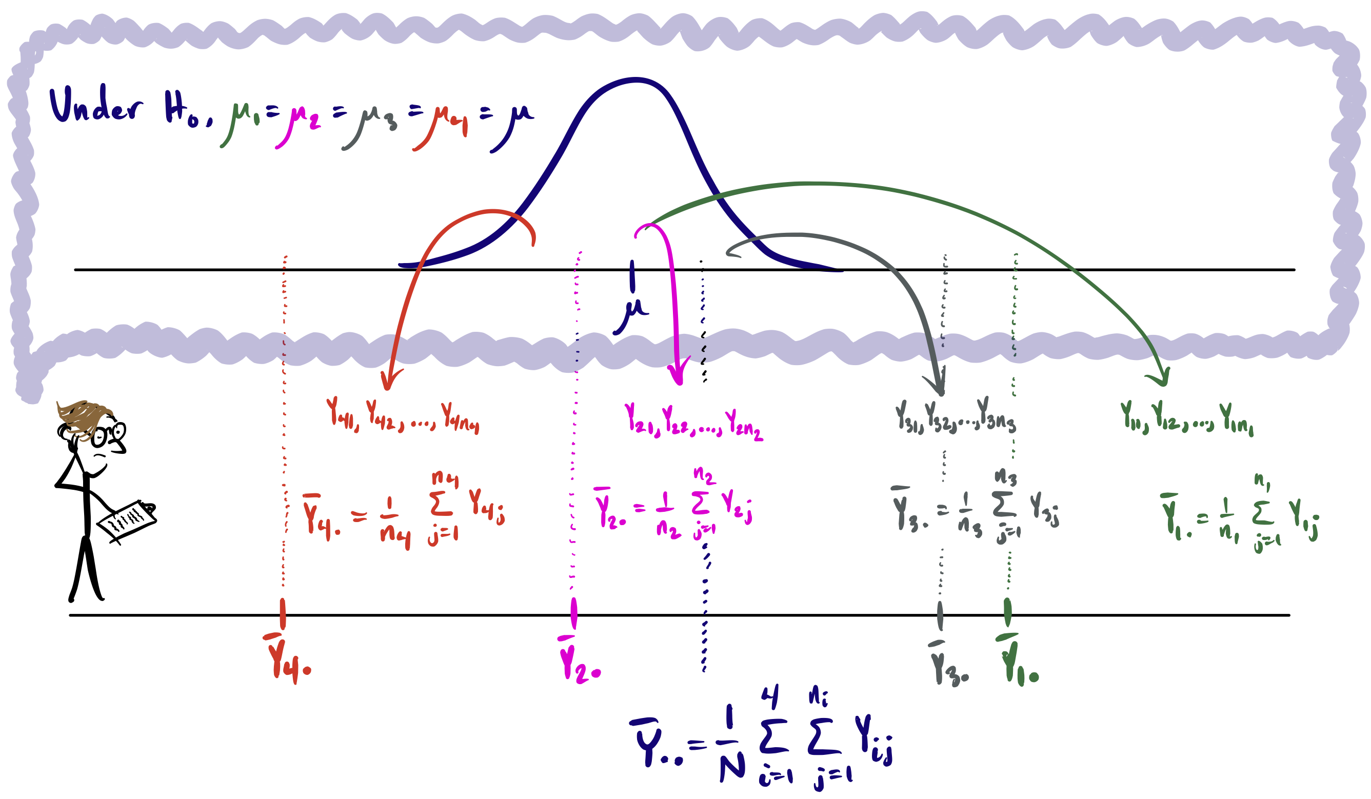 A new quantity which we may call the overall mean is introduced in the above picture. If it is assumed that all responses in all the treatment groups really come from a single distribution centered at a common mean \(\mu\), then a sensible estimator of the common mean is the mean of all the responses pooled together, which we write as \[