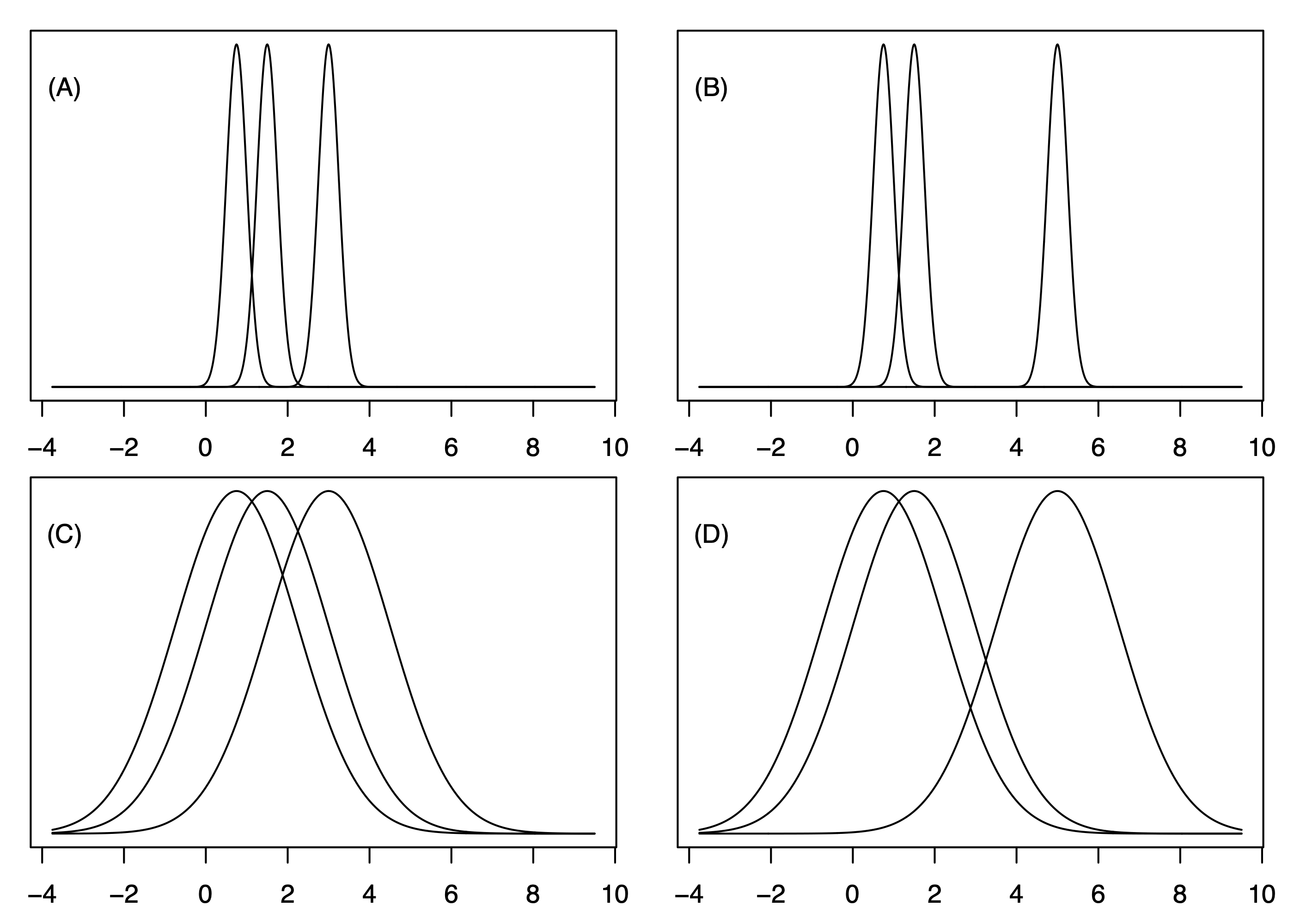 Exercise 31.1 (Between versus within treatment variation) Consider the three probability density functions depicted in each panel of the following figure as the distributions of the responses in a cell means or one-way ANOVA model with \(K = 3\) treatments.