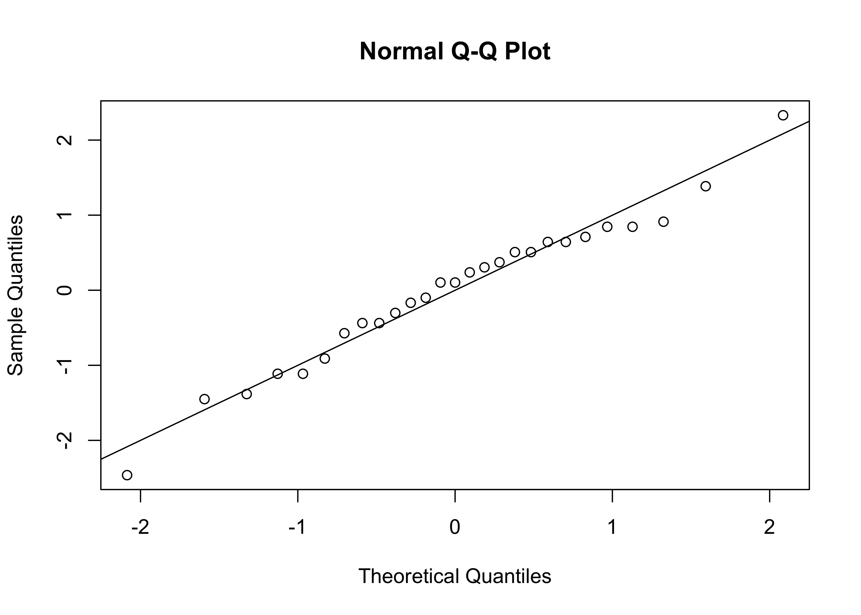 \tag{19.2}\] which is the plot produced by the qqnorm() function in R. This version of the normal QQ plot plots the data quantiles against the corresponding quantiles of the standard normal distribution, that is the \(\mathcal{N}(0,1)\) distribution. Here, we simply look to see if the points lie along a straight line (though it is no longer the \(y=x\) line).