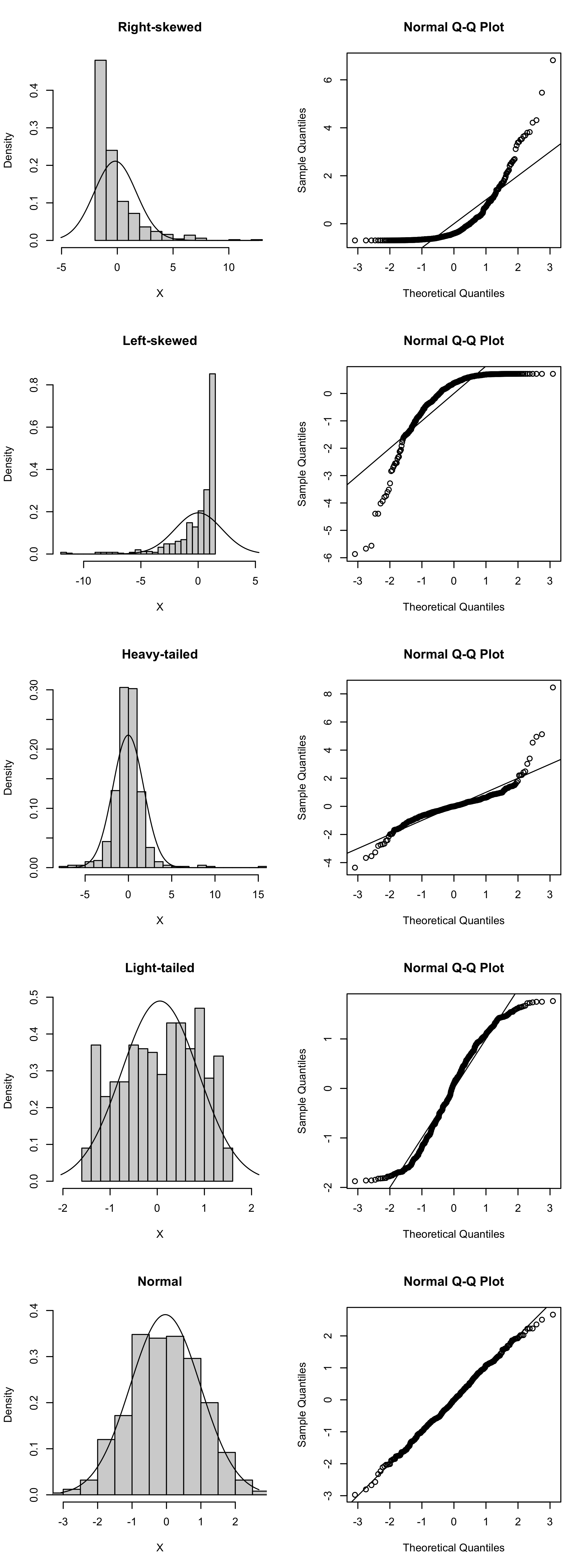 set.seed(3)n <-500settings <-c("Right-skewed","Left-skewed","Heavy-tailed","Light-tailed","Normal")XX <-matrix(0,n,length(settings))# right skeweda <-1/2b <-3XX[,1] <-rgamma(n,shape = a, scale = b) - a*b# left skeweda <-1/2b <-3XX[,2] <- a*b -rgamma(n,shape = a, scale = b)# heavy-tailedXX[,3] <-rt(n,2.5)# light-tailedXX[,4] <- (rbeta(n,1.25,1.25)-1/2)*3# normalXX[,5] <-rnorm(n)par(mfrow =c(length(settings),2))for(i in1:length(settings)){ X <- XX[,i] xbar <-mean(X) sn <-sd(X) lo <-min(X,qnorm(0.005,xbar,sn)) up <-max(X,qnorm(0.995,xbar,sn)) x <-seq(lo,up,length=500) fx <-dnorm(x,xbar,sn) h <-hist(X,plot=FALSE,breaks=20)plot(h, main=settings[i],freq=FALSE,ylim =c(0,max(h$density,fx)),xlim =c(lo,up))lines(fx~x)qqnorm(scale(X))abline(0,1)}