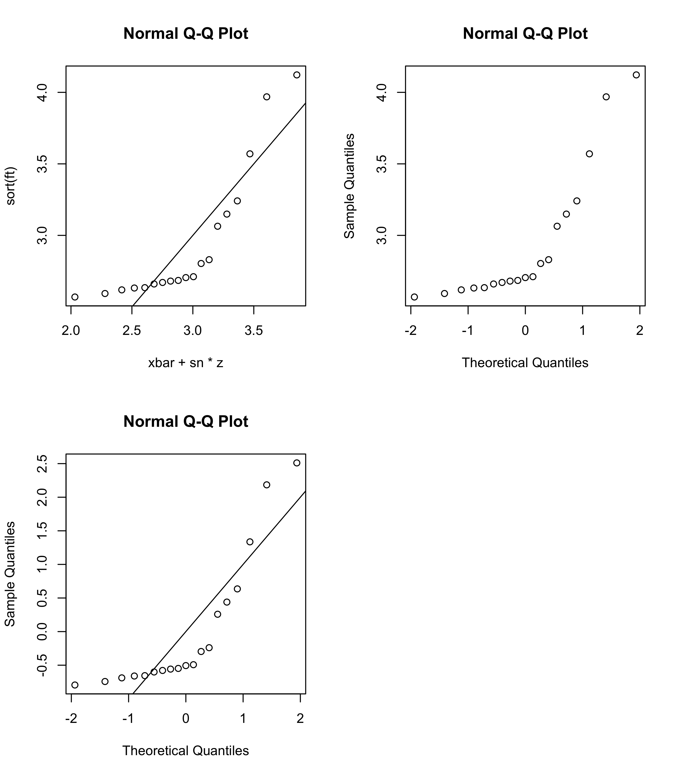 ft <-c(2.5692,2.5936,2.6190,2.6320,2.6345,2.6602,2.6708,2.6804,2.6850,2.7049,2.7111,2.8034,2.8300,3.0639,3.1489,3.2411,3.5701,3.9686,4.1220)xbar <-mean(ft) sn <-sd(ft) n <-length(ft)par(mfrow=c(2,2))# first way to make the normal QQ plotu <- (c(1:n) -1/2) / nz <-qnorm(u)plot(xbar + sn*z,sort(ft),main ="Normal Q-Q Plot")abline(0,1)# default normal QQ plot in Rqqnorm(ft)# standardize data values firstqqnorm(scale(ft))abline(0,1)
