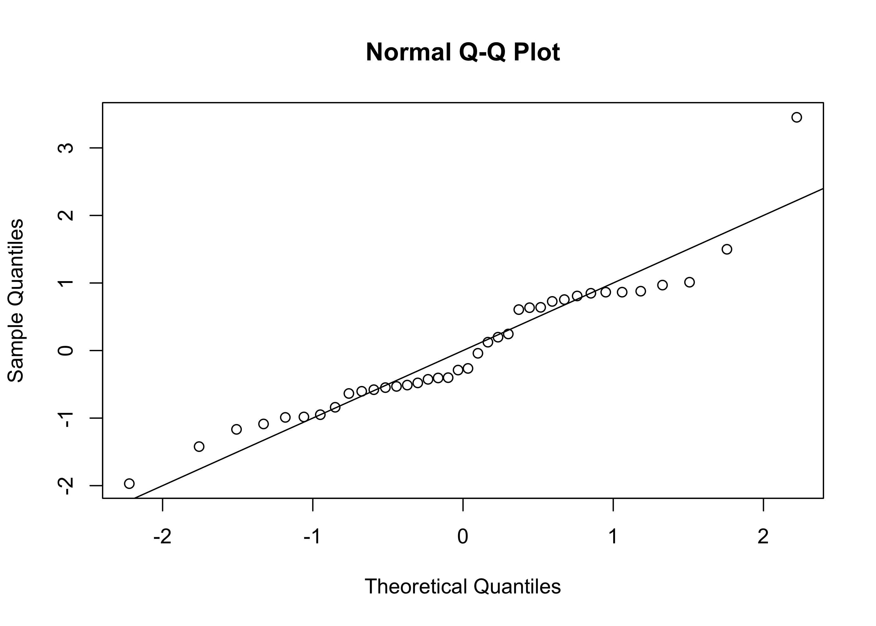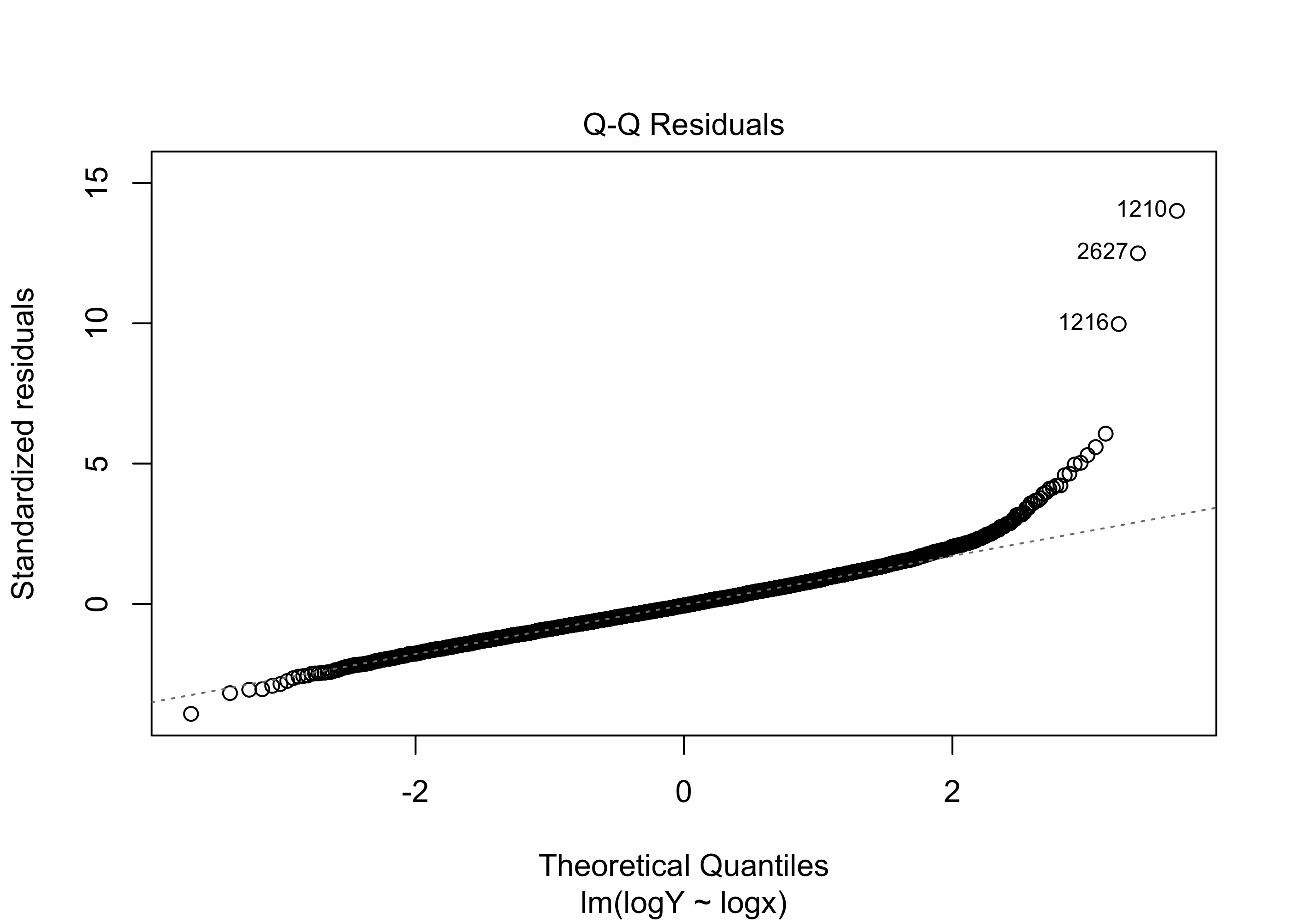 Figure 33.17 exhibits a scatterplot and residuals versus fitted values plot indicating that the assumptions of the simple linear regression model are satisfied. Given the very large sample size (\(n = 4176\)), it is not important to check the assumption that the responses are normally distribution around the regression line. For what it’s worth, the normal Q-Q plot of the residuals obtained from the simple linear regression model using the log-transformed response and covariate is shown in Figure 33.18. The plot suggests a considerable deviation from normality; however, again, because of the large sample size, the estimator \(\hat \beta_1\) will still have approximately a normal distribution, so that we need not doubt the validity of confidence intervals for \(\beta_1\) or of p-values for testing hypotheses about \(\beta_1\).