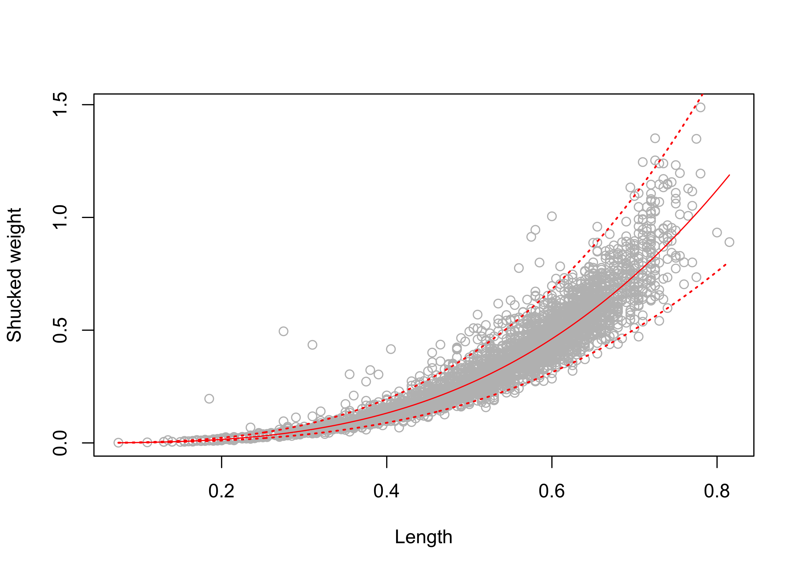n <- length(Y)Note that there are \(4176\) observations in the data set. Can we reliably predict the shucked weight of the abalone from its length?