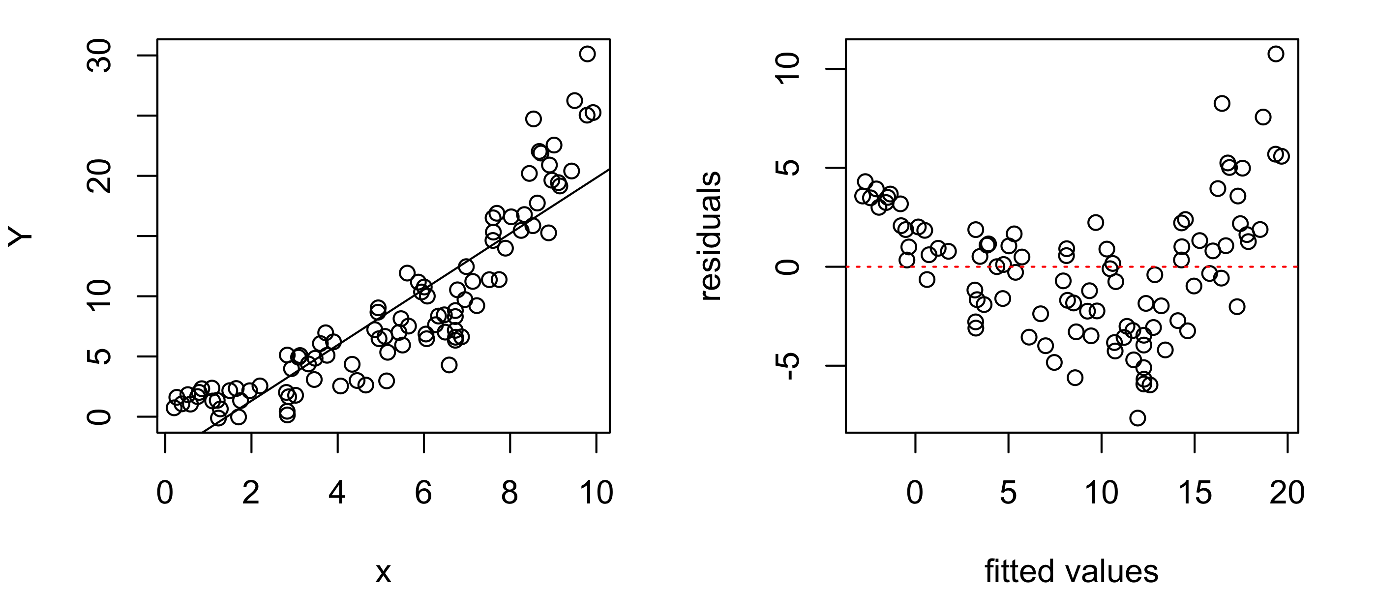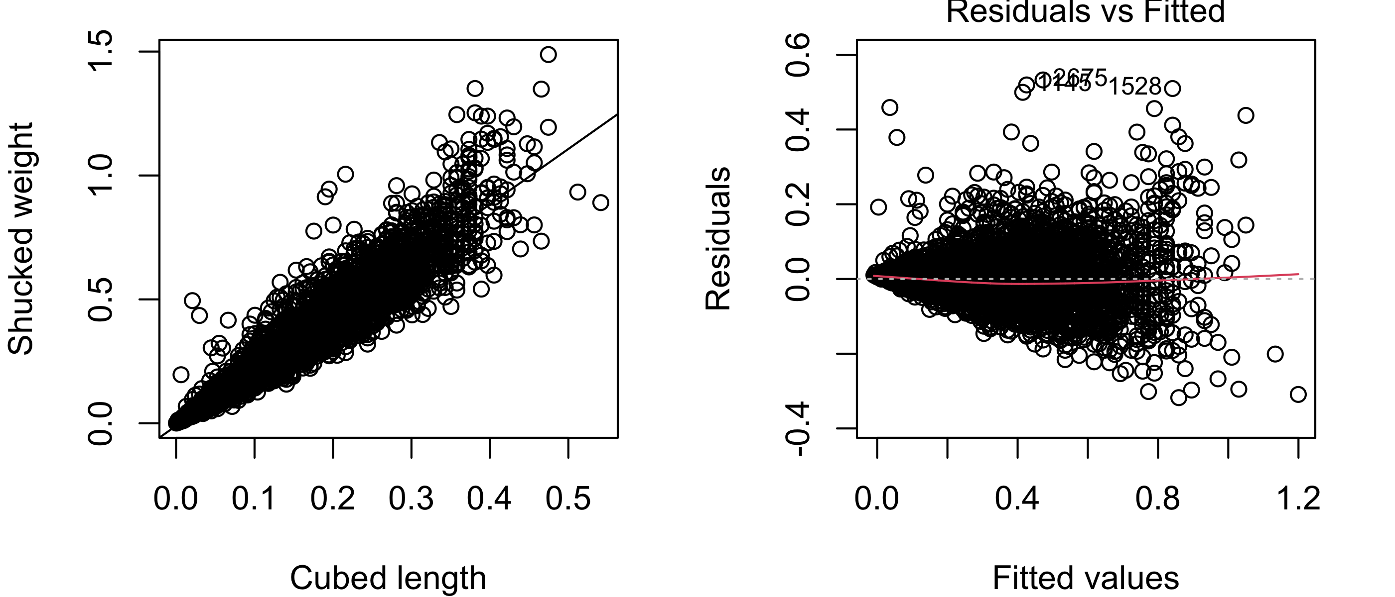 Figure 33.15 shows in the left panel a scatterplot of the shucked weight measurements versus the length measurements with the least-squares line overlaid. The right panel shows the residuals versus fitted values plot. In these plots it is apparent that the relationship between the shucked weight and the length of abalones is non-linear. The simple linear regression model is not suitable for these data.
