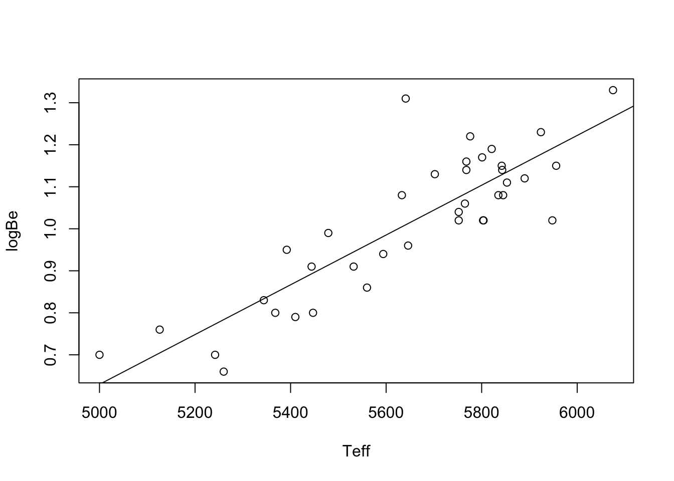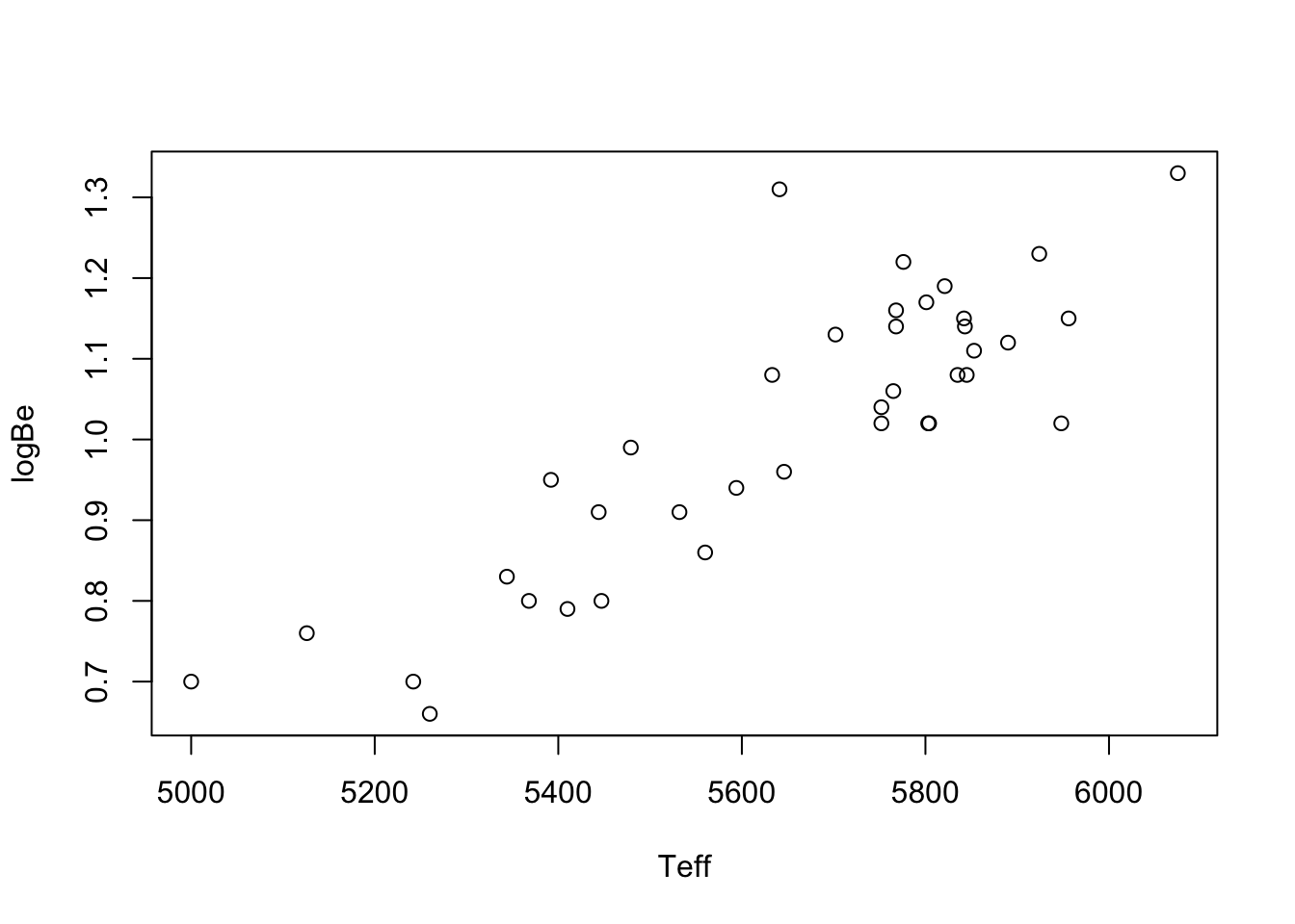 Example 8.1 (Beryllium data) These data are taken from Santos et al. (2004) and can be downloaded in a .Rdata file from here. The \(x\) values in te scatterplot are temperatures of stars and the \(Y\) values are the natural log of the beryllium abundances in the corresponding stars.