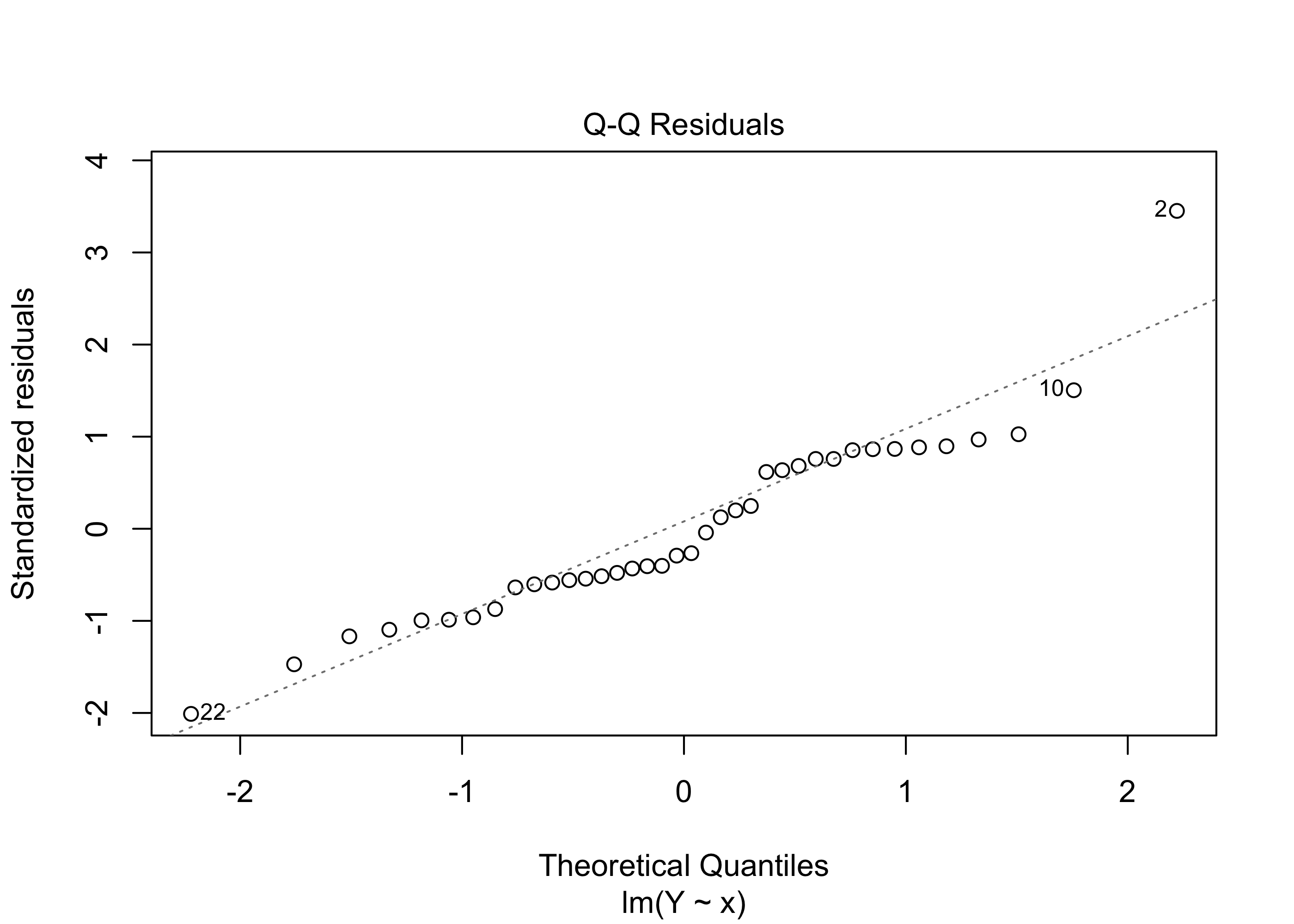 Note that we can obtain the sample variance of the observed response and covariate values as \(s^2_Y = (n-1)^{-1}S_{YY}\) and \(s^2_X = (n-1)^{-1}S_{xx}\), respectively. Then, to compute the least-squares estimators of the regression coefficients \(\beta_0\) and \(\beta_1\), one may obtain the slope as \(\hat \beta_1 = r_{xY}(s_Y/s_x)\) and then the intercept as \(\hat \beta_0 = \bar Y_n - \hat \beta_1 \bar x_n\).