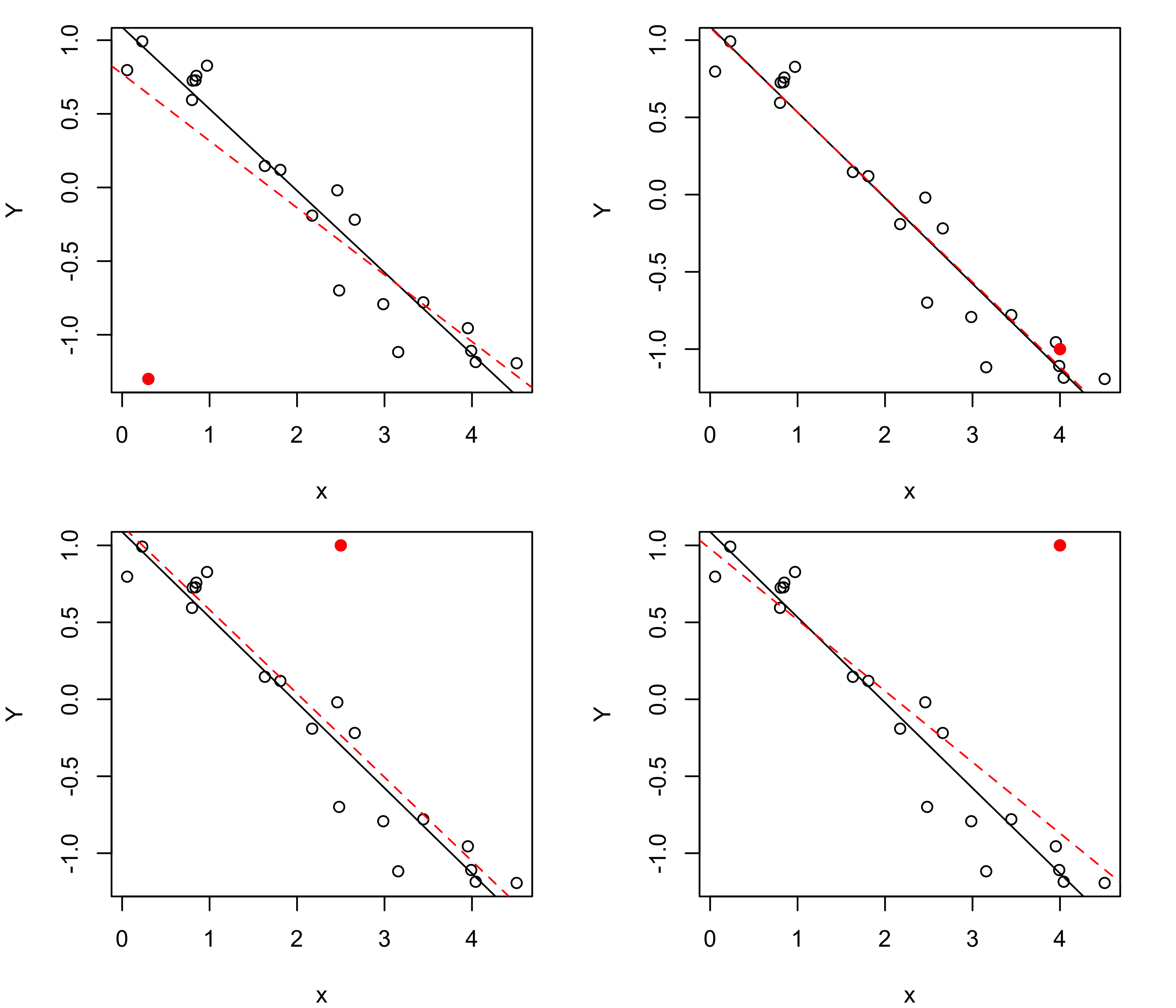 Figure 33.20 shows scatterplots of a set of \(n =10\) data pairs \((x_1,Y_1),\dots,(x_n,Y_n)\), plotted as open circles, to which an additional data pair has been added, plotted as a filled circle. The solid line in each plot is the least-squares line based on the original \(n\) data points, while the dashed line is the least-squares line of all the data points, including the additional point. We see that when a point is added which lies close to the least-squares line based on the original data points, the line does not change by much. However, if the new point lies far from the least-squares line based on the original data points, the line will change more; moreover, if the new point is far away, but lies near the center of the observed covariate values (the \(x\) values), the least-squares line will be shifted up or down by some small amount, but if, in addition to lying far away from the least-squares line, it also lies far from the center of the observed covariate values, it will have a more dramatic effect on the fitted line.