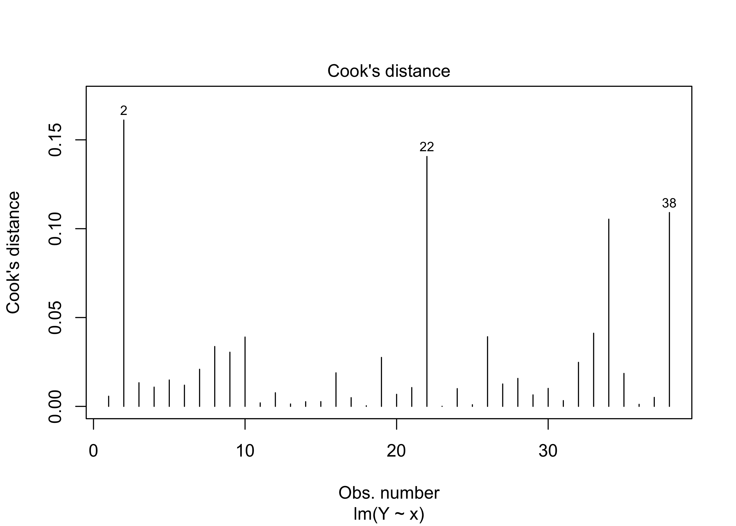 Definition 33.4 (Cook’s distance) The Cook’s distances of the observations \((x_1,Y_1),\dots,(x_n,Y_n)\) are defined as \[ D_i = \frac{1}{2 \hat \sigma^2}\sum_{j = 1 }^n(\hat Y_j - \hat Y_{j(i)})^2 = \frac{\hat e_i^2}{2\hat \sigma^2}\frac{\text{lev}_i}{(1 - \text{lev}_i)^2} \] for \(i =1,\dots,n\).